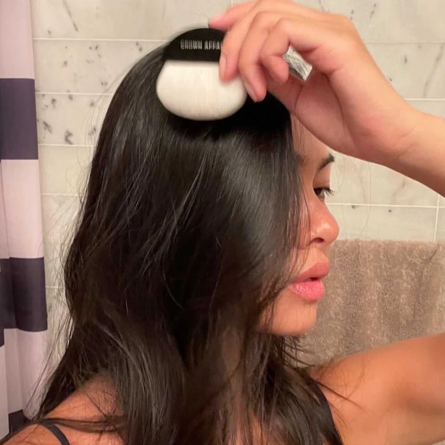 The powder texture is very fine and will absorb once you've thoroughly brushed the product through your hair with The Kabuki Brush or your fingers.